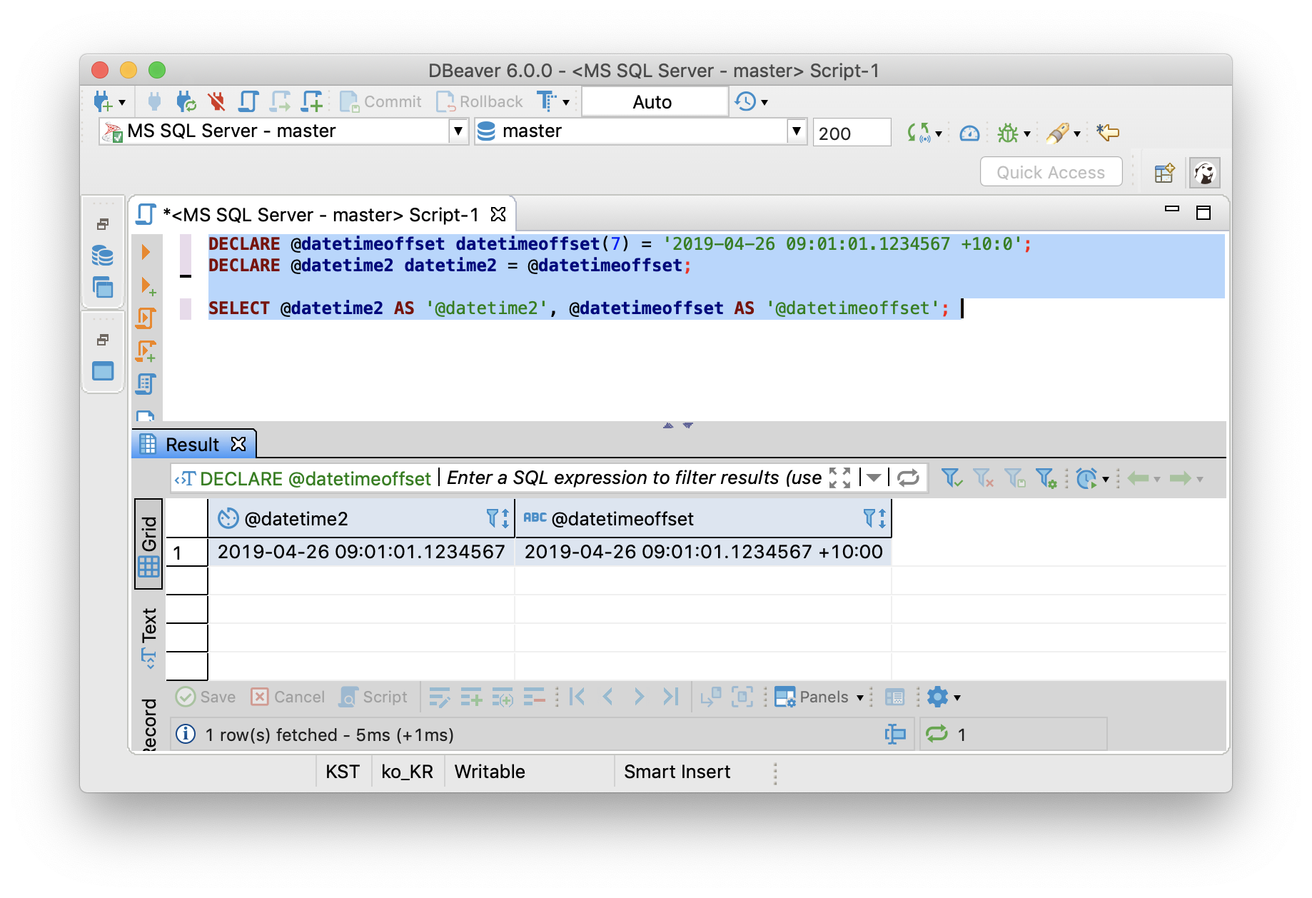 datetime2의 경우 소숫점 7자리까지 정확도가 표시 되었으며, offset은 짤린 것을 볼 수 있습니다.