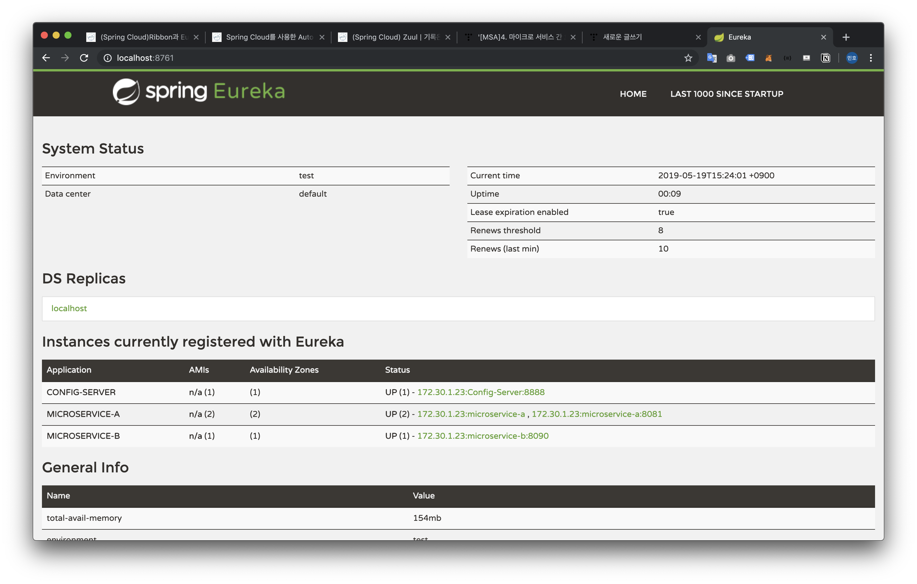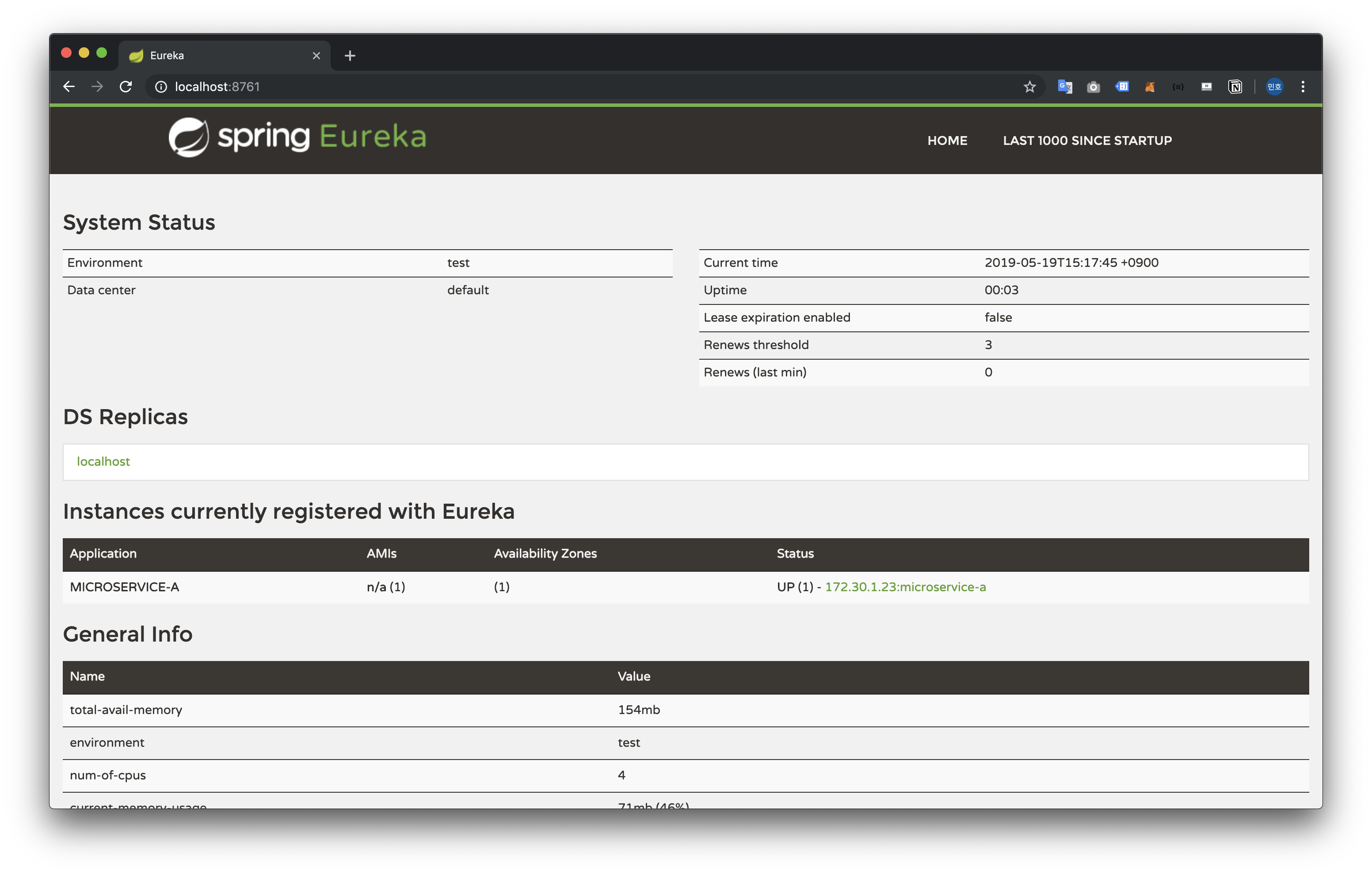 중간 아래쯤 [Instances currently registered with Eureka]에 보시면 [MICROSERVICE-A]라고 추가 된 것을 볼 수 있습니다.