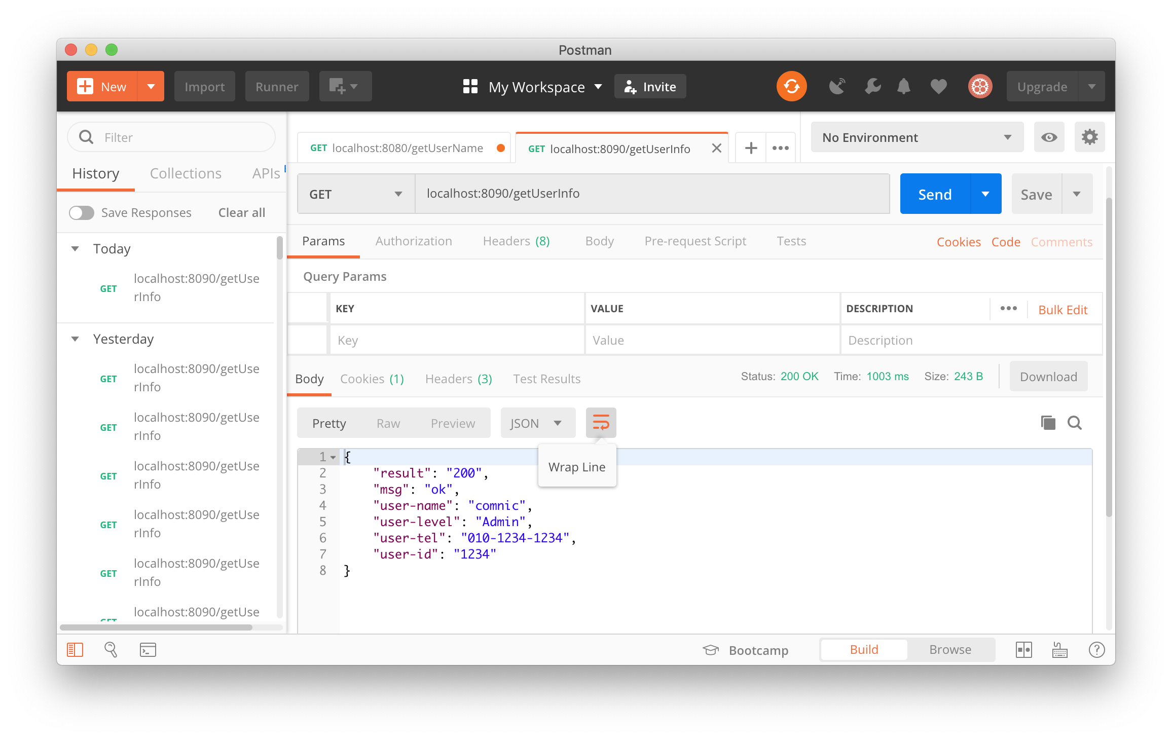 위와 같이 모든 설정이 마무리 되었다면, 기존과 같이 service-b(8090)의 getUserInfo를 호출해면 다음과 같이 값을 잘 받아 오는 것을 보실 수 있습니다. 내부적으로 user-name은 service-a(8080, 8081)의 호출해서 받아온 값입니다.