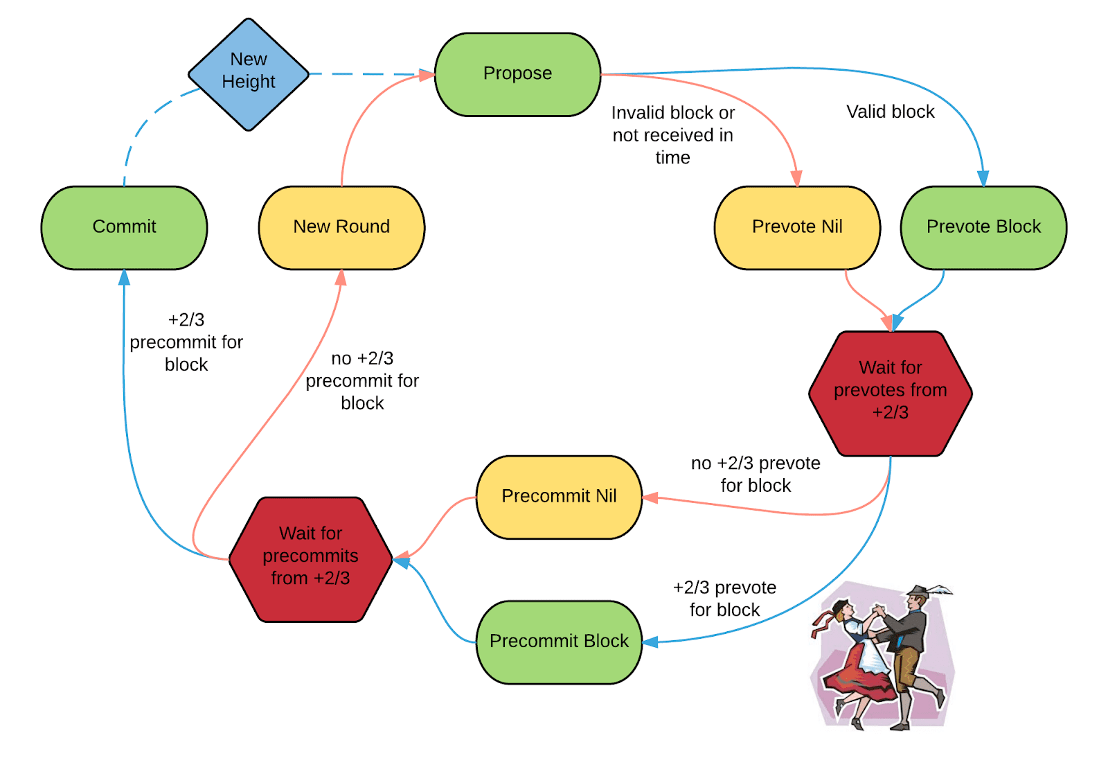 검증자는 폴카 댄스처럼 뭔가를 하기때문에 폴카를 하는 커플의 그림이 있다. 동일한 블록에 사전 투표한 검증자가 2/3보다 많을 때, 우리는 그것을 폴카라 부른다. 모든 사전 커밋은 동일한 라운드에서 한 폴카로 정당화 되어야 한다.