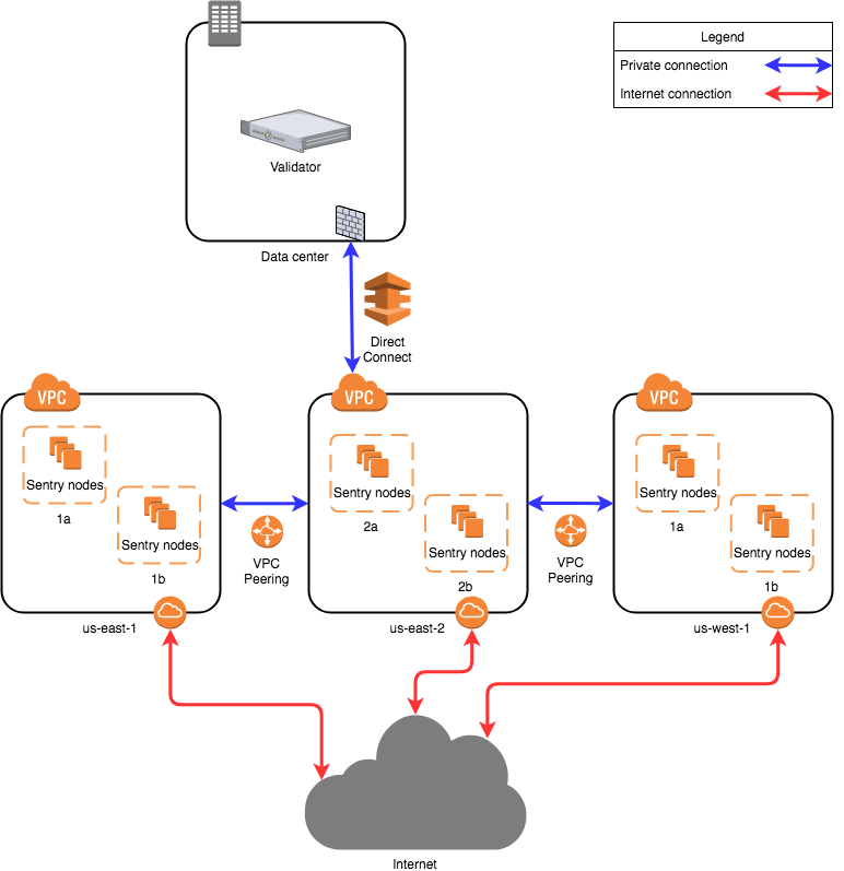 아마존은 한 리전(region)에 여러개의 AZ(Availability Zones)을 가지고 있다. 하나는 다른 리전에도 센트리 노드(보초 노드)를 설치할 수 있다. 이 경우에 두 번째, 세번째 또는 더 많은 리전들이 검증자 노드에 대한 비공개 연결이 필요하다. 이는 VPC Peering(구글 클라우드에서는 “VPC Network Peering”)에 의해 달성될 수 있다. 이 경우 두 번째, 세 번째 또는 그 이상의 리전의 센트리 노드는 첫 번째 리전으로 이동하고 데이터 센터에 대한 직접 연결을 통해 검증자에 도달한다.