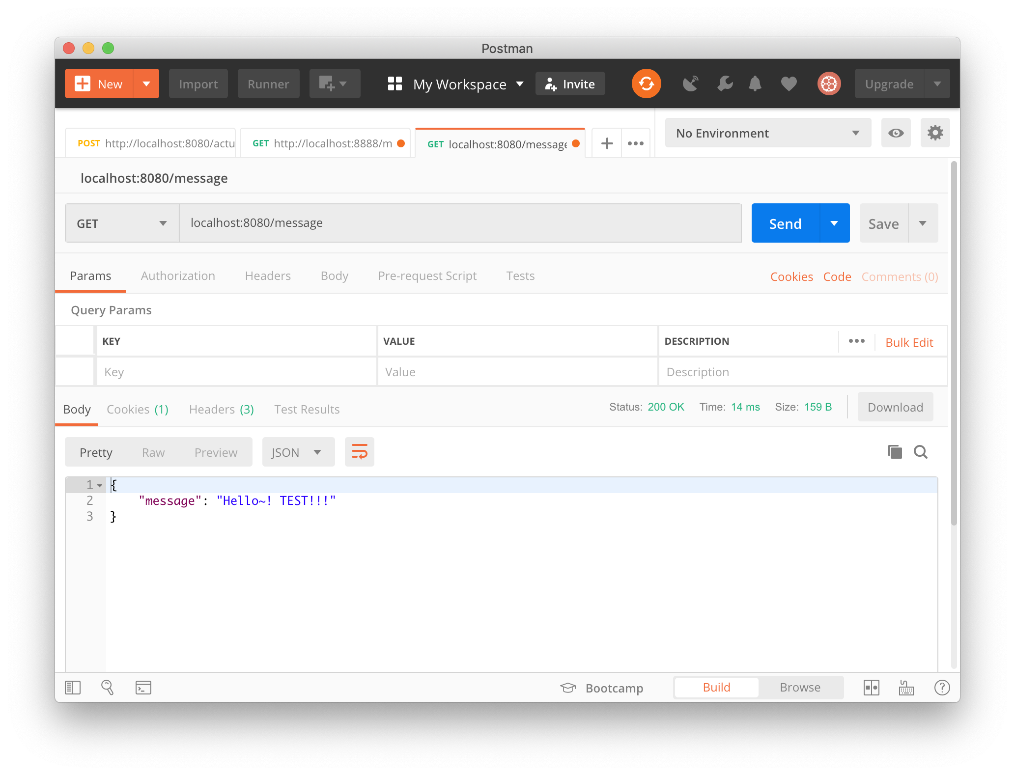 우리가 위에서 만든 간단한 서비스인 message의 값을 반환하는 endpoint로 접속해 봅니다.