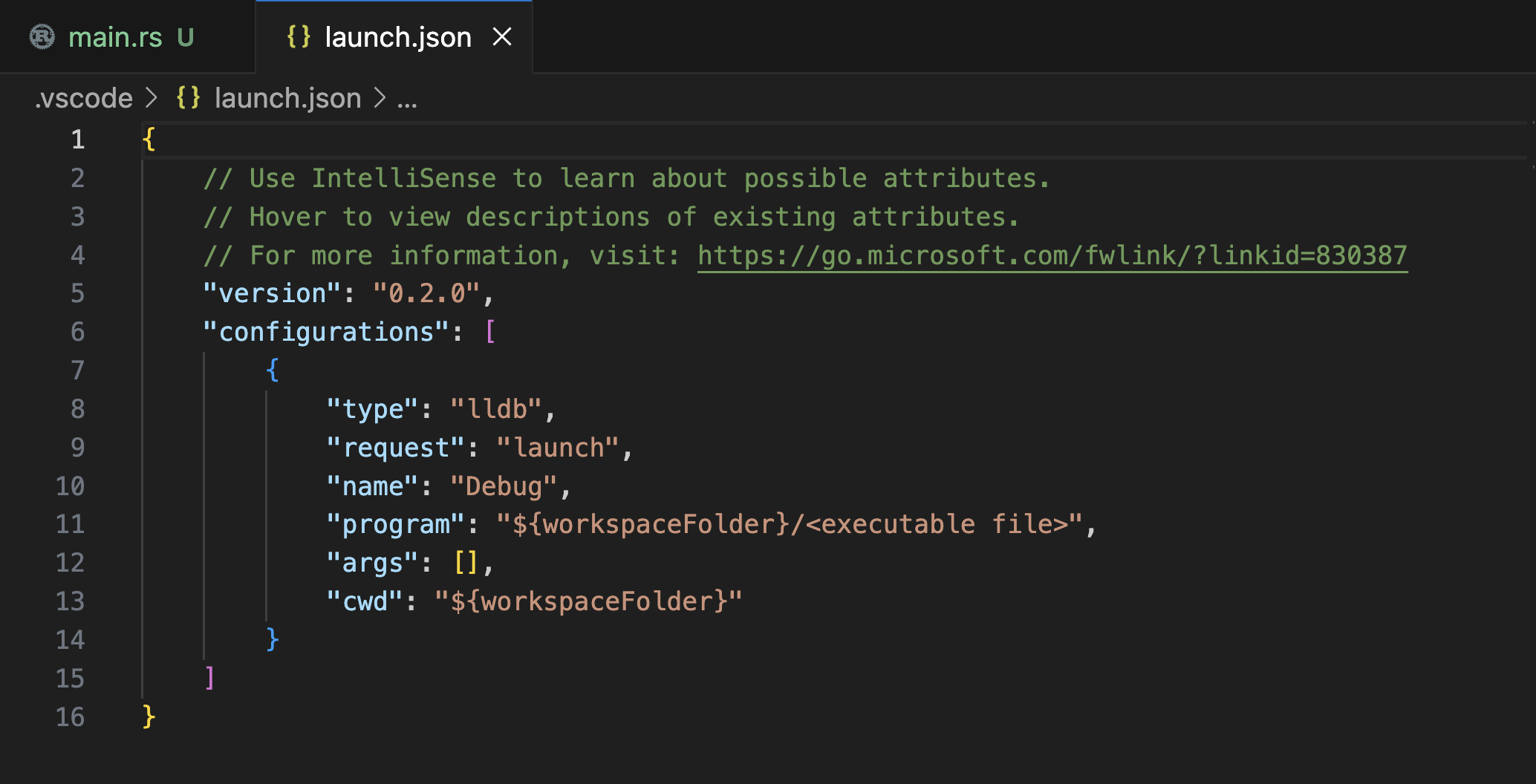 - "preLaunchTask": "cargo build"는 디버깅을 시작하기 전에 프로젝트를 빌드하는 작업을 수행합니다.