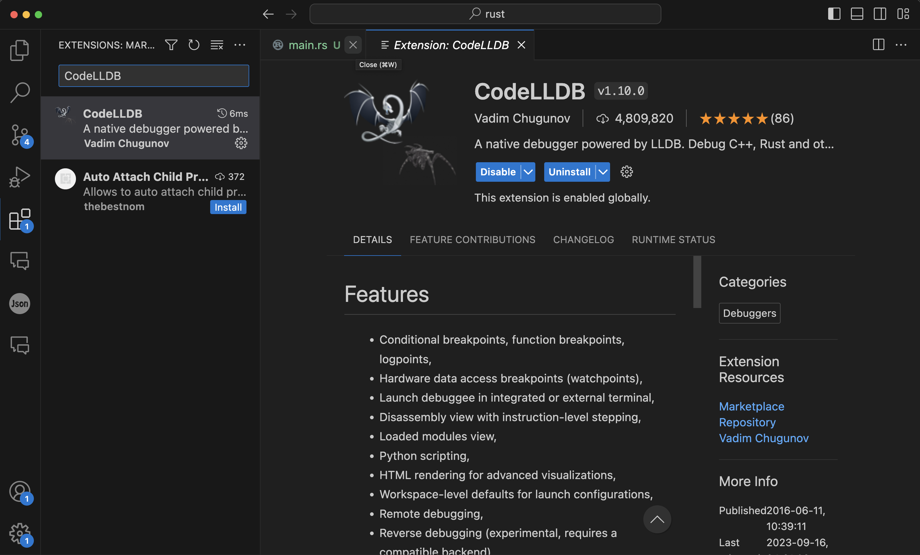 먼저 VS Code의 extension을 설치해 줍니다. [CodeLLDB]를 검색해서 아래와 같이 설치해 줍니다.