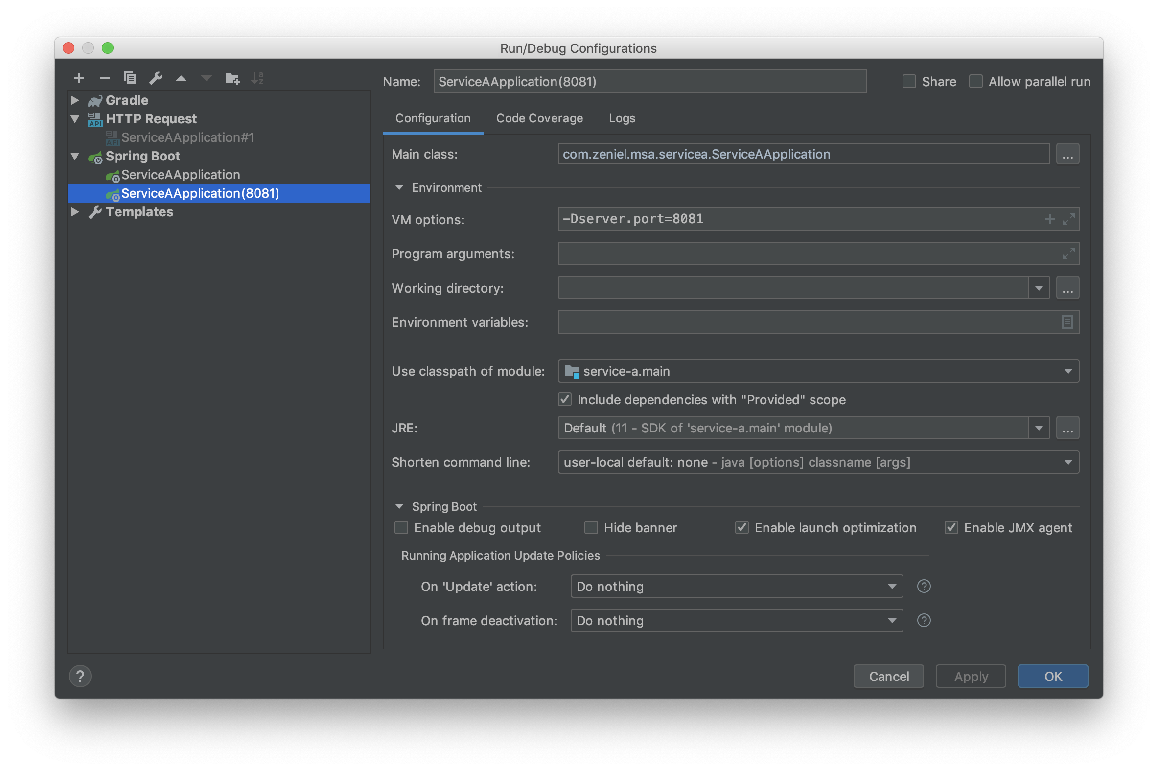 테스트를 위해 지난번에 만든 service-a를 다른 port로 하나 더 띄우기 위해 간단히 설정하도록 하겠습니다.